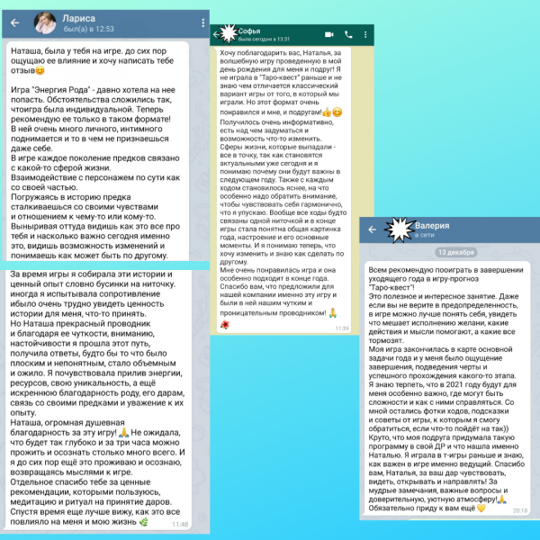 Участники получают инсайты и озарения, новый взгляд на привычные вещи, больше ясности и понимания в своем запросе или жизненной ситуации. И все это происходит легко, в увлекательной игровой форме.