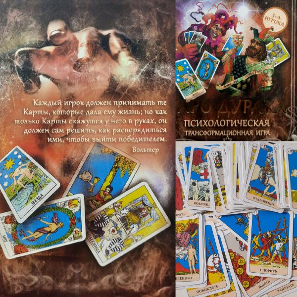 "ТАРО ДУРАКА" - инструмент для внутренней работы, который сочетает три источника: знакомую карточную игру, мудрость Арканов Таро и психологическую коррекцию. Игра позволяет получить больше ясности и устойчивости в волнующей ситуации, увидеть свою роль в ней, понять как эффективнее действовать в конкретном запросе, помогает открыть и активизировать энергию для достижения желаемого.